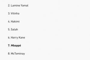 体育资讯09月27日讯 队报公布了2025年金球奖各国记者的投票详情,其中韩国记者将前三顺位选票投给了登贝莱、亚马尔、维蒂尼亚,姆巴佩位列第7,佩德里未能进入前10。