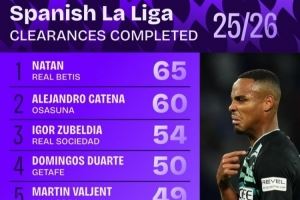 体育资讯10月7日讯 日前,Squawka统计了本赛季西甲解围次数排行,贝蒂斯后卫纳坦65次居首,祖贝迪亚54次第三。